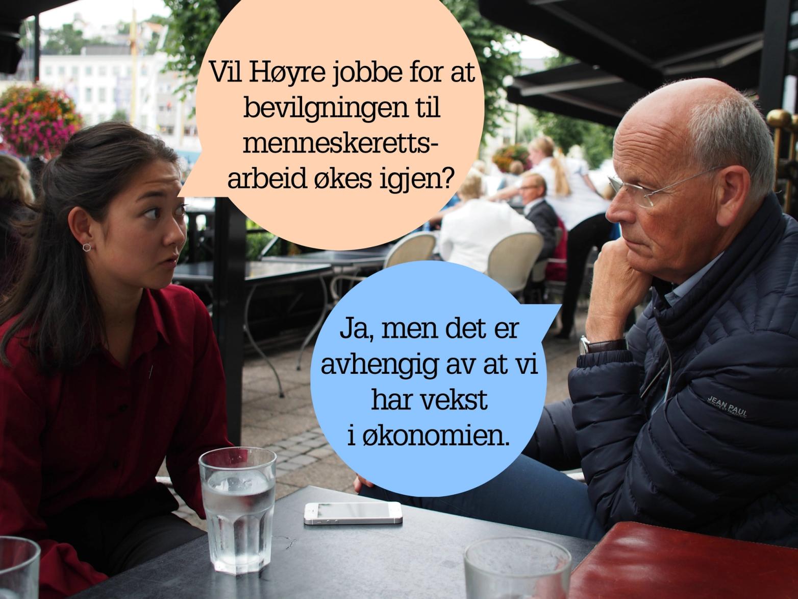 Beathe: - Nå har det jo vært veldig mye kutt i bevilgningene til menneskerettsarbeid de siste årene. Vil Høyre jobbe for at bevilgningen skal økes igjen?