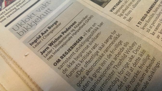 Av Ingrid Aas Borge, leder i Changemaker og Jørn Wichne Pedersen, leder i Studentenes og Akademikernes Internasjonale Hjelpefond (SAIH).